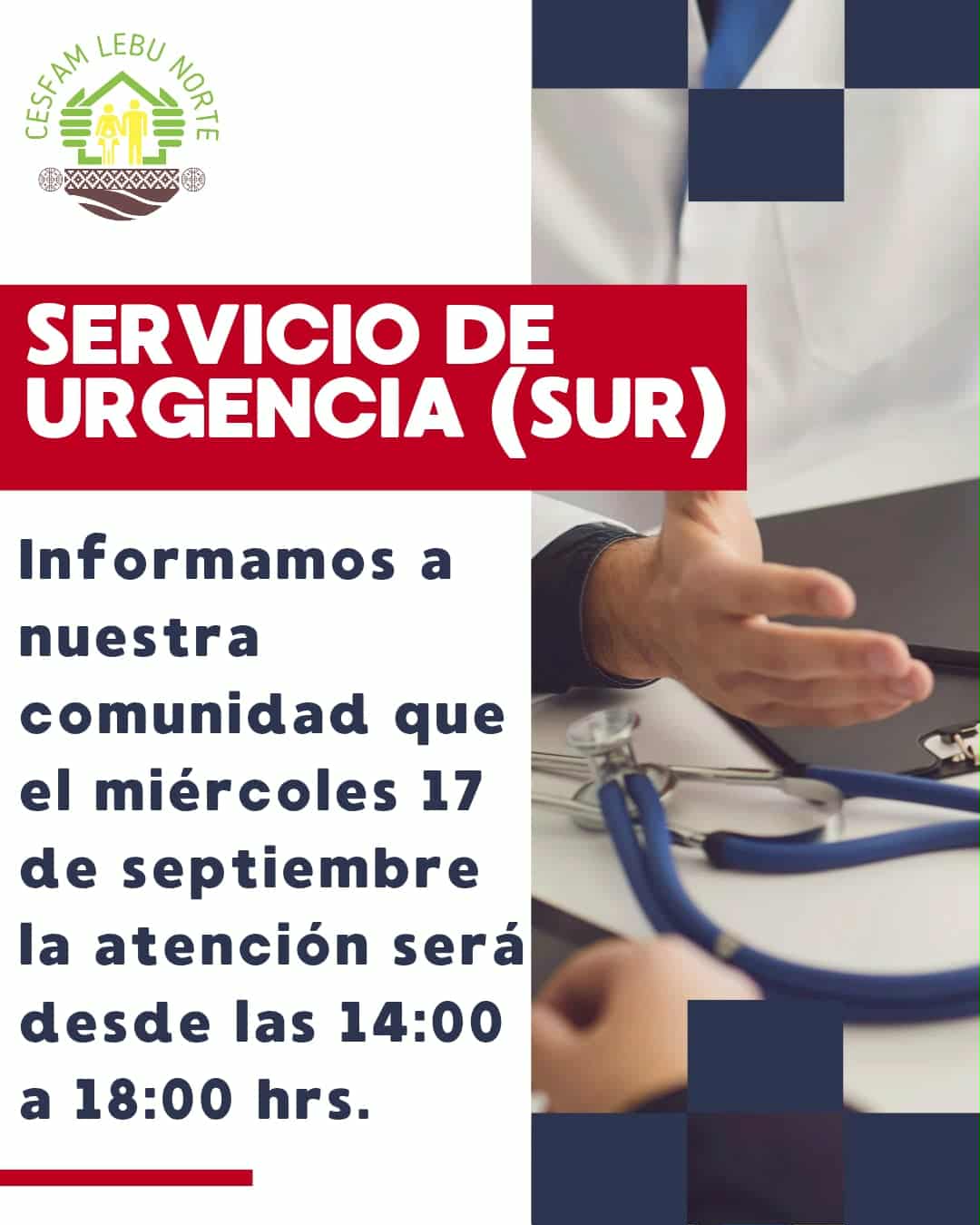 El Servicio de Urgencia (SUR) del Cesfam Lebu Norte informa a la comunidad que el horario de atención para este miércoles 17 de septiembre será de 14:00 a 18:00 horas.