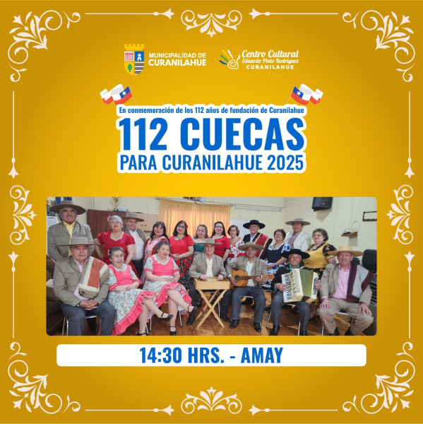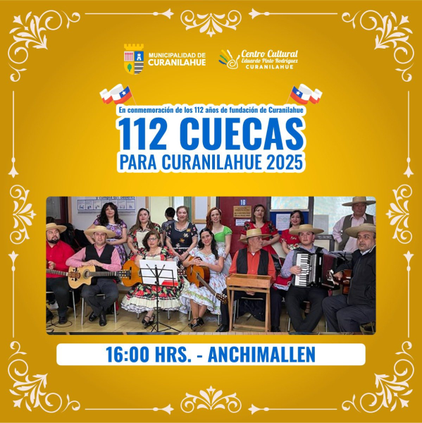 La Municipalidad de Curanilahue, encabezada por el alcalde y el Honorable Concejo Municipal, invita cordialmente a la comunidad a participar de una nueva versión de las tradicionales 112 Cuecas para Curanilahue, evento cultural que forma parte de la programación oficial del aniversario comunal.