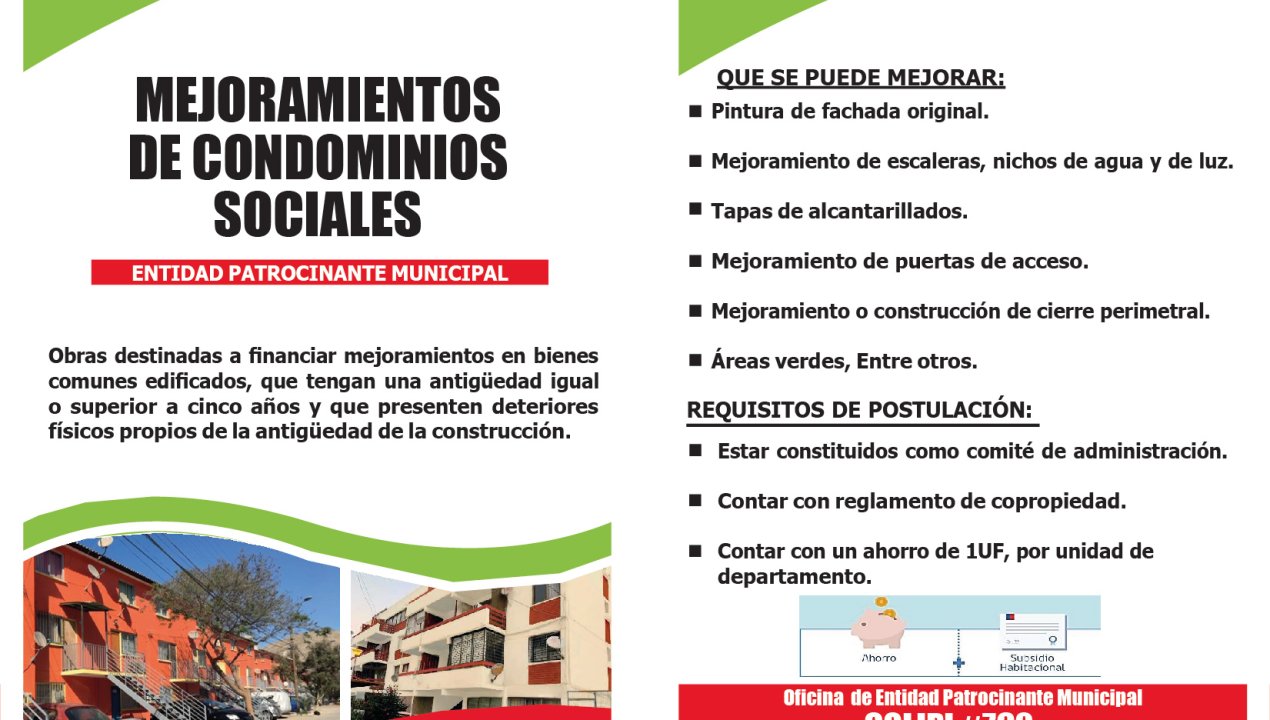 Mejoramiento de condominios sociales con obras destinadas a financiar mejoramientos en bienes comunes edificados, que tengan una antigüedad igual o superior a cinco años y que presenten deterioros físicos propios de la antigüedad de la construcción.