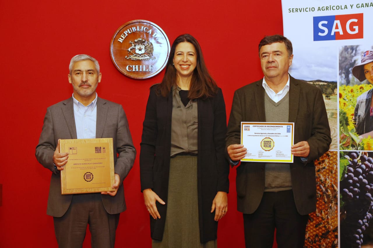 En el Palacio de La Moneda, el Servicio Agrícola y Ganadero, SAG, recibió el Sello de Igualdad de Género en categoría Oro, otorgado por el Programa de las Naciones Unidas para el Desarrollo (PNUD). La ceremonia fue encabezada por el Ministro de Agricultura, Esteban Valenzuela, y el Director Nacional del SAG, José Guajardo Reyes, quien recibió la distinción de manos de la representante residente del PNUD en Chile, Georgiana Braga-Orillard. Este reconocimiento es el resultado de un intenso trabajo de implementación de dos años de distintas políticas y mecanismos orientados a reducir la brecha de género al interior de la institución, así como también en su relación con usuarios y usuarias.