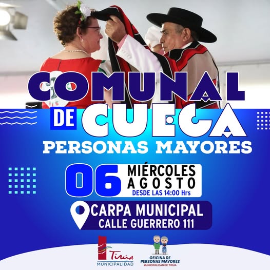 El próximo miércoles 6 de agosto, a partir de las 14:00 horas, la comuna de Tirúa vivirá una nueva versión del Comunal de Cueca para Personas Mayores, evento que se desarrollará en la Carpa Municipal y que invita a toda la comunidad a ser parte de una jornada llena de identidad, tradición y emoción.