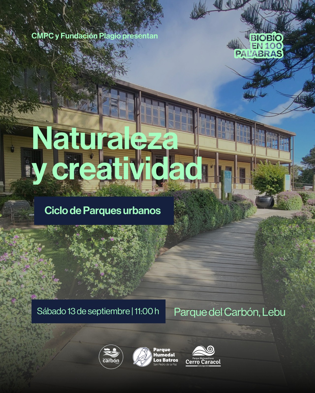 Este sábado 13 de septiembre a las 11:00 horas, la edición XIV de Biobío en 100 Palabras invita a las familias de la región a una expedición gratuita por el Parque del Carbón en Lebu, donde podrán explorar uno de los pulmones verdes más emblemáticos del territorio. La actividad, que requiere inscripción previa, es parte de la Trilogía de Parques Urbanos organizada por el concurso de relatos breves, presentado por CMPC y Fundación Plagio.