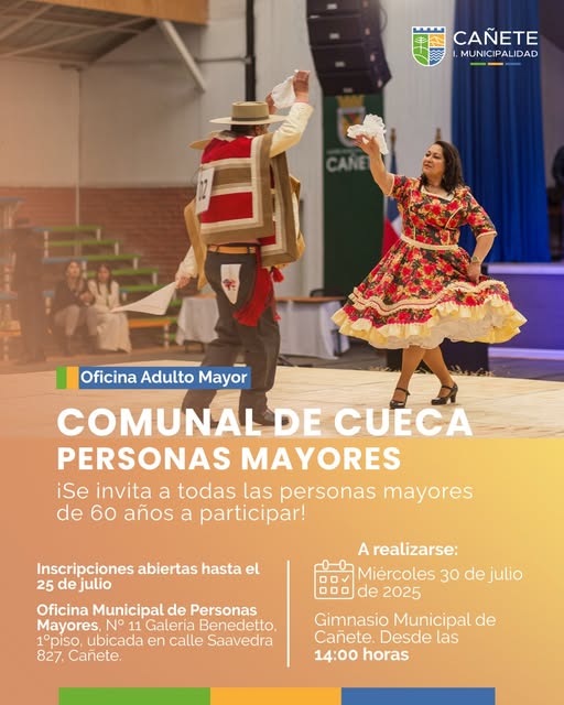 La Municipalidad de Cañete, a través de su Oficina Municipal del Adulto Mayor, invita a todas las personas mayores de 60 años a participar en el Comunal de Cueca 2025, una actividad que busca promover el envejecimiento activo, la vida saludable y la valoración de nuestras tradiciones.