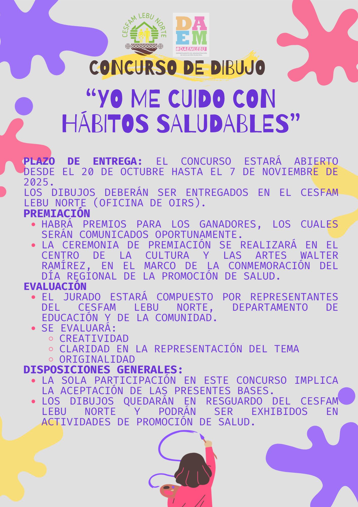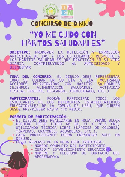 Desde Pre-Kínder hasta 4° Medio— a participar en el Concurso de Dibujo “Yo me cuido con hábitos saludables”, una iniciativa que busca promover la reflexión y la expresión artística en torno al autocuidado y la vida saludable.