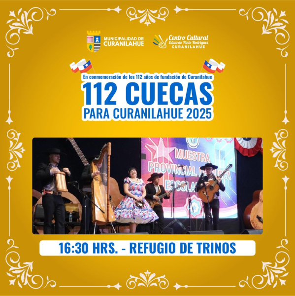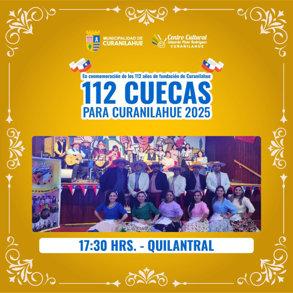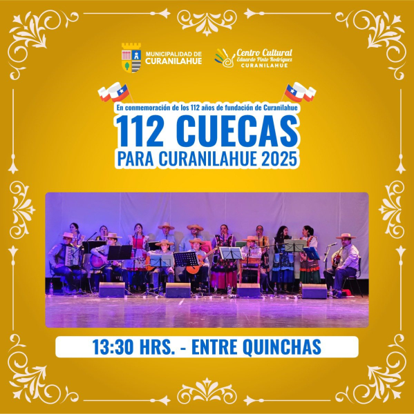 La Municipalidad de Curanilahue, encabezada por el alcalde y el Honorable Concejo Municipal, invita cordialmente a la comunidad a participar de una nueva versión de las tradicionales 112 Cuecas para Curanilahue, evento cultural que forma parte de la programación oficial del aniversario comunal.