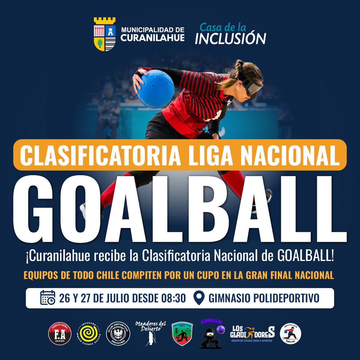 La Municipalidad de Curanilahue, en conjunto con la Casa de la Inclusión, invita a la comunidad a ser parte de una destacada jornada deportiva: la fecha clasificatoria de la Liga Nacional de Goalball, que reunirá a delegaciones provenientes de distintas regiones del país.