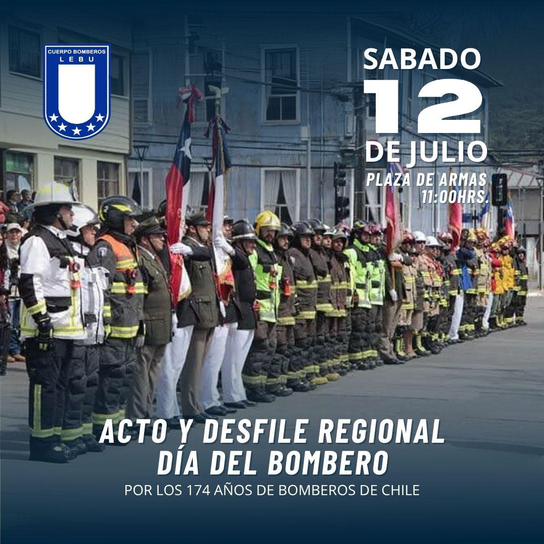 El Cuerpo de Bombero Lebu invita a toda la comunidad a participar del Desfile Regional en homenaje a los 174 años de la fundación de Bomberos de Chile, el cual se llevará a cabo el sábado 12 de julio, a las 11:00 horas, en la Plaza de Armas de la comuna.