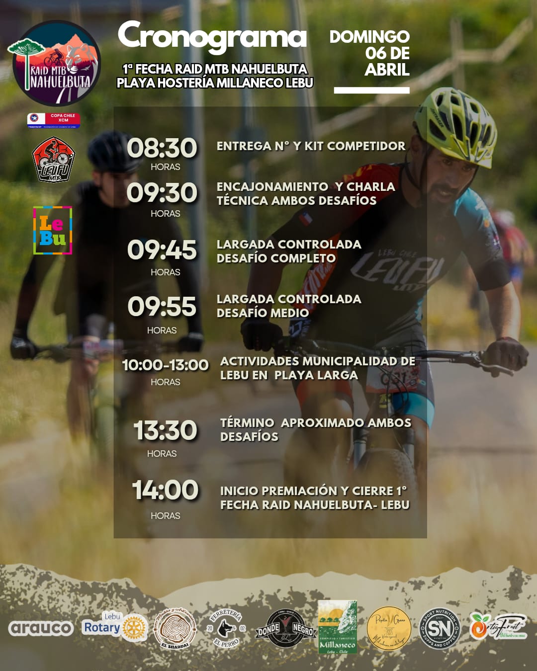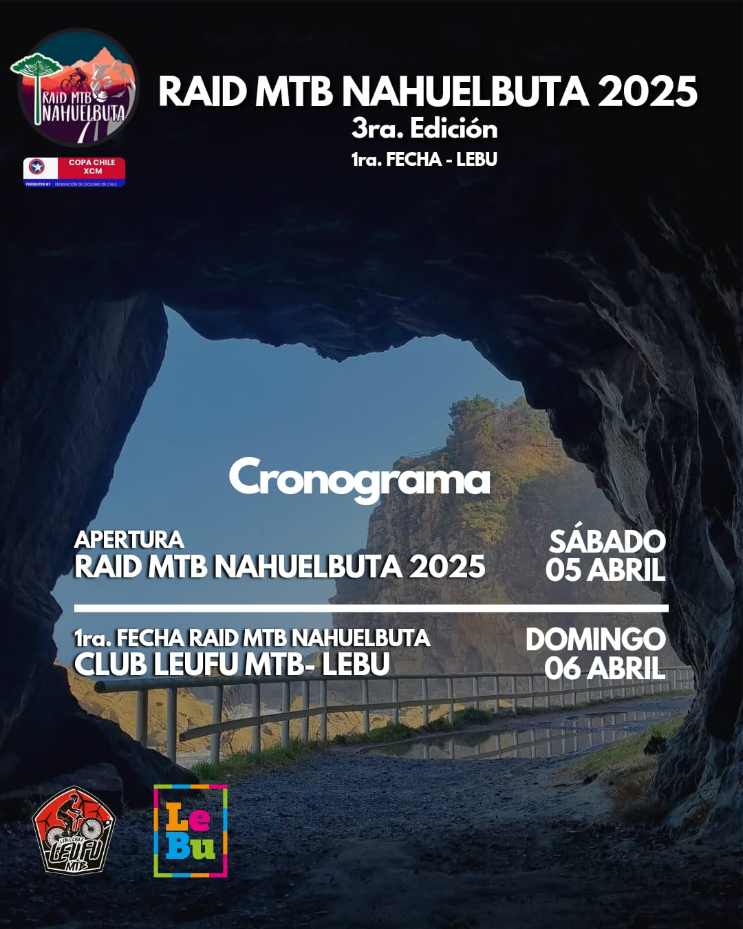 Es por ello que la Federación Nacional de Ciclismo de Chile y el Club de Ciclismo LEUFU MTB, tienen el agrado de invitar a participar a todos y todas las y los deportistas federados y no federados, a la primera fecha del RAID NAHUELBUTA EN SU TERCERA EDICIÓN, con el apoyo de la “Ilustre Municipalidad de Lebu” a realizarse el día domingo 06 de abril del 2025 desde las 9:30 hrs. en el sector Playa Larga, Hostería Millaneco.