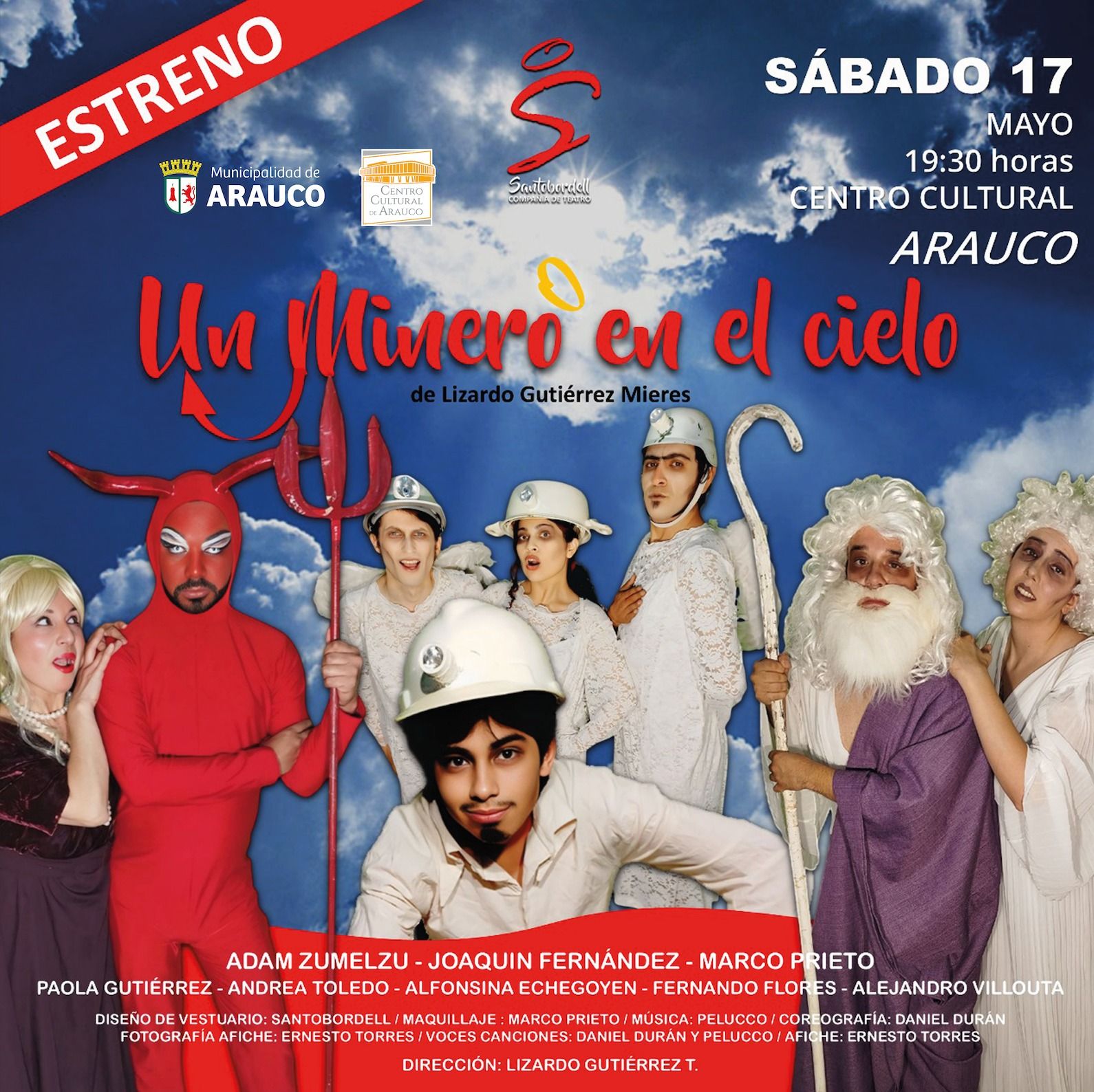El próximo sábado 17 de mayo, a las 19:30 horas, el Centro Cultural de Arauco será escenario del regreso de la reconocida compañía nacional Teatro Santobordell, que presentará su aclamada obra "Un Minero en el Cielo".