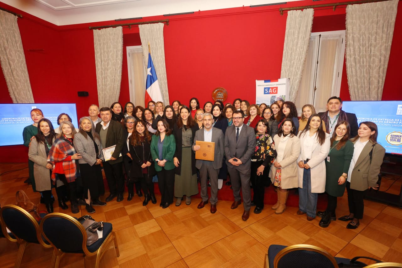 En el Palacio de La Moneda, el Servicio Agrícola y Ganadero, SAG, recibió el Sello de Igualdad de Género en categoría Oro, otorgado por el Programa de las Naciones Unidas para el Desarrollo (PNUD). La ceremonia fue encabezada por el Ministro de Agricultura, Esteban Valenzuela, y el Director Nacional del SAG, José Guajardo Reyes, quien recibió la distinción de manos de la representante residente del PNUD en Chile, Georgiana Braga-Orillard. Este reconocimiento es el resultado de un intenso trabajo de implementación de dos años de distintas políticas y mecanismos orientados a reducir la brecha de género al interior de la institución, así como también en su relación con usuarios y usuarias.