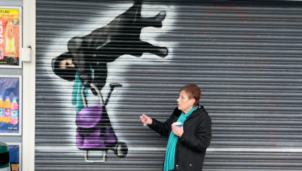 Le street artiste @Tee2Sugars rend hommage à la dame qui a eu un accident avec le volet d’un magasin. Plus de peur que de mal pour une mésaventure qui a fait le tour du web il y a quelques jourspic.twitter.com/eZvWnlmsXS